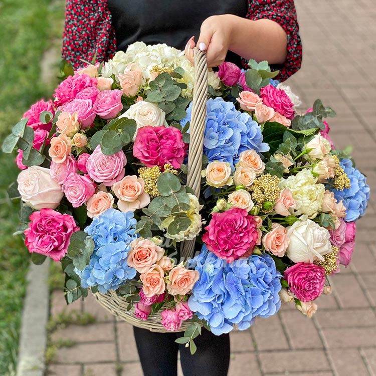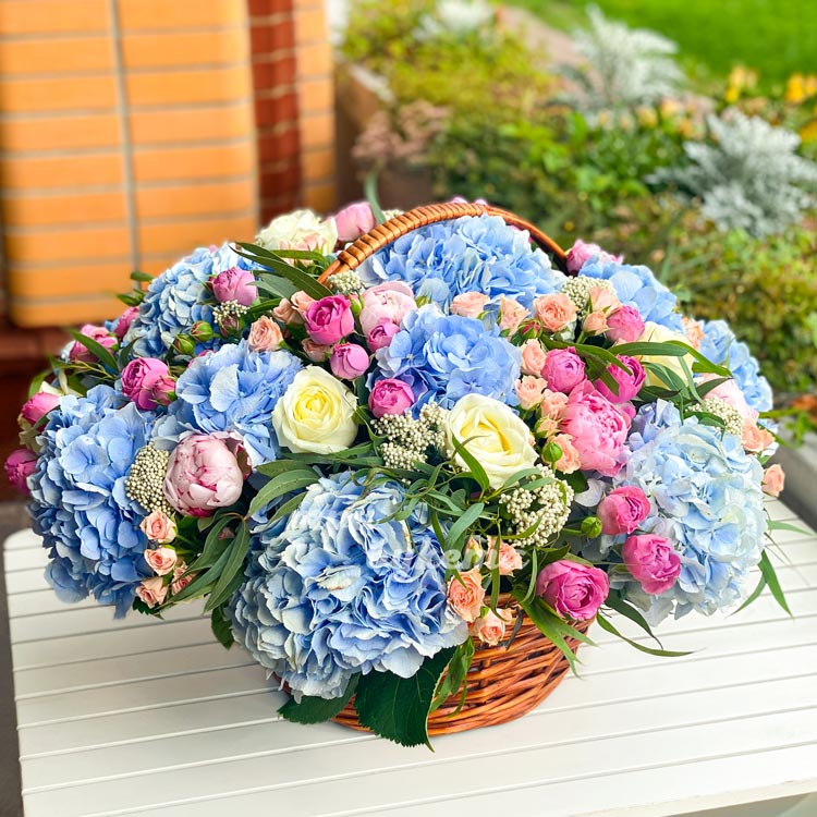 Корзина синих гортензий и роз