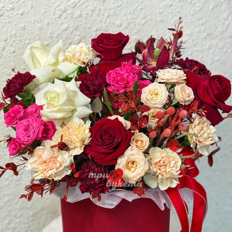 Красная коробка роз, гвоздик и зелени