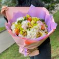 Пионы, маттиолы и розы в корзине